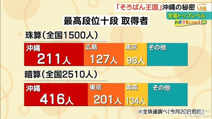 珠算・暗算の最高段位、十段の取得者数を全国の支部ごとに見てみると、その結果は一目瞭然。どちらも2位に大きな差をつけ堂々の1位!沖縄はまさに「そろばん王国」なんです。