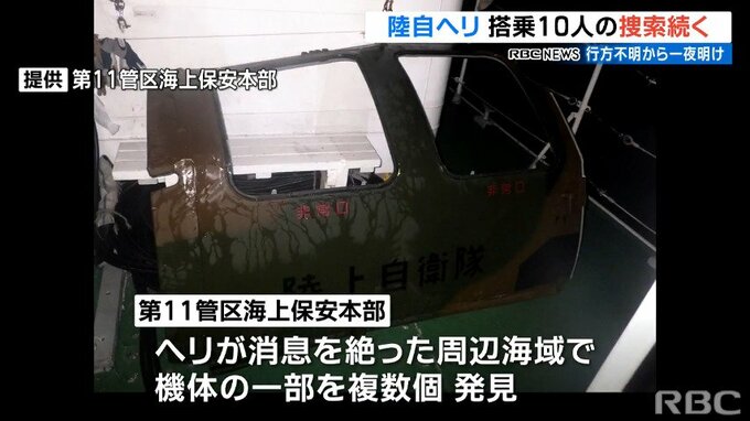 第11管区海上保安本部によりますとこれまでの捜索で、ヘリが消息を絶った海域周辺で陸上自衛隊と記された窓枠をはじめ救命ボートや機体の一部が複数個、見つかっています。