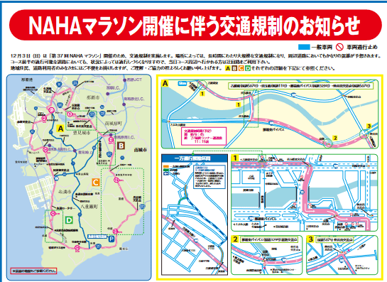 12月3日(日)に那覇市の明治橋交差点をスタートし、南風原町、南城市、八重瀬町、糸満市、豊見城市をめぐるNAHAマラソン。大会実施に伴い、各地域で交通規制が敷かれます。