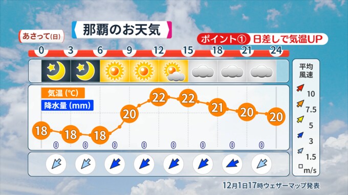 NAHAマラソン当日は曇りの予想ですが、詳しくみると午前から昼過ぎにかけては日差しが届くところもありそうです。