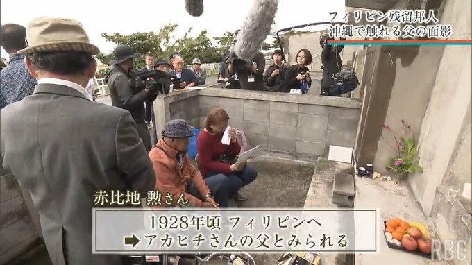 フィリピンで戦死した勲さんの遺骨の代わりに、石が葬られているこの墓で、アカヒチさんは、自分の父とされる赤比地勲さんの写真を初めて目にしました。