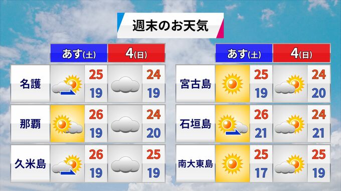 気温グラフをみると、那覇では土日までは天気の大きな崩れはありませんが、月曜日以降は前線や低気圧の影響ですっきりしない天気になりそうです。