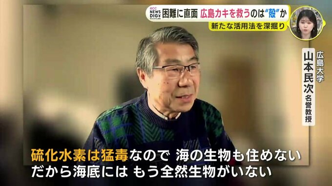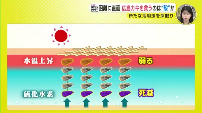 表面の水温が上がると上の方のカキが弱るだけでなく、海の底が酸欠状態になり、何十年もかけて蓄積したヘドロの中で菌の動きが活発化。大量に発生した硫化水素が下の方のカキも死滅させると考えられています。この問題の救世主が、カキ殻だというのです。