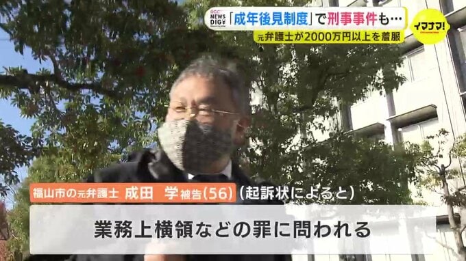 福山市の元弁護士・成田学 被告(56)は、後見人などとして男女3人から預かった2348万円余りを着服したとして、業務上横領などの罪に問われています。