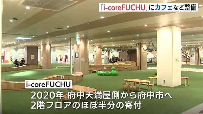 府中市は、2020年に府中天満屋側から店舗2階のフロアほぼ半分の寄付を受けました。このうち3100平方メートルを活用して翌年7月に人工芝の広場などを設けた施設をオープンさせました。