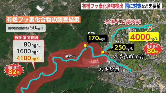 これらの物質は、近年、米軍基地の近くでの検出が全国で相次いでいて、東広島市の検出地点も米軍川上弾薬庫に隣接しています。