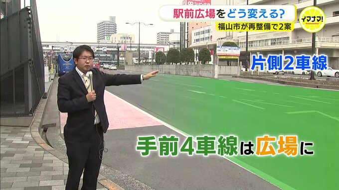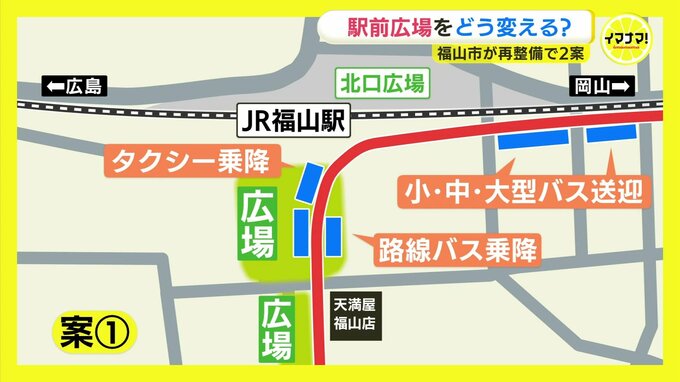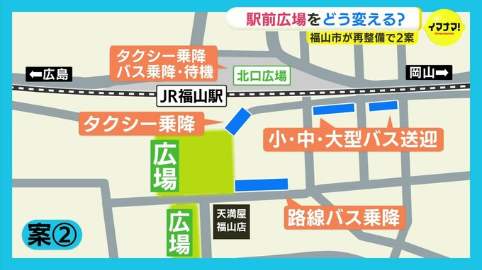 もう一つは、駅前広場を全面的に広場にする案です。タクシー乗降場を駅北口や駅南口周辺の伏見町に配置し、路線バスなどの乗降場と待機場を駅北口に集積するほか、天満屋福山店の近くの伏見町南側に乗降場を設けるといったものです。