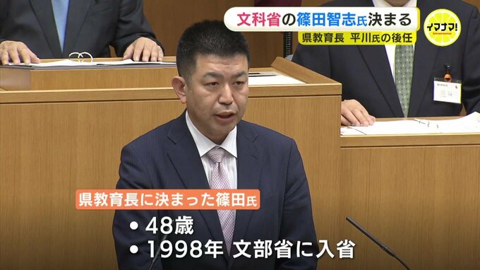 広島県の新しい教育長に文科省の篠田智志氏 全会一致で可決 平川教育長の後任に 2024年2月26日(月) 19:52 国内 広島県の新たな教育長に、文部科学省の官僚で文化庁政策課長の篠田智志氏が就任することが決まりました。県議会では、3月末で任期満了となる平川理恵教育長の後任に、篠田氏を起用する人事案が提案されました。採…