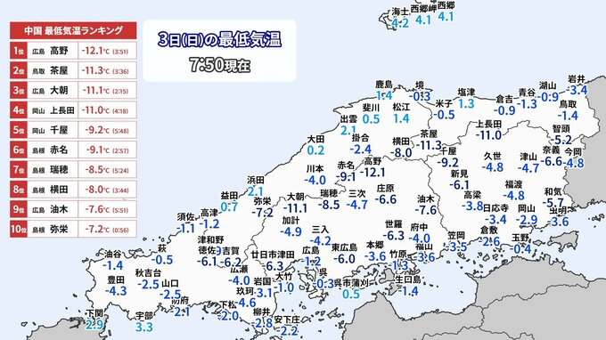 中国山地にある気象庁の4つの観測点では、2日夜から3日朝にかけて今シーズン初めて-10℃を下回りました。