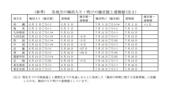 現時点での気象庁の梅雨明け(入り)の発表は、あくまで「梅雨明け(入り)したと見られる」という速報的なものです。気象庁の発表文をよくみると、注意事項として、「後日、検討を行い、発表期日が変更となる場合がある」と記載されています。
