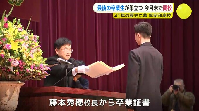小雪が舞うなか、2日に卒業式が行われたのは、呉市焼山にある呉昭和高校です。最後の卒業生となった生徒63人と門出を祝う保護者らが出席しました。1人ひとりの名前が呼ばれ、藤本秀穂 校長からクラスの代表に卒業証書が手渡されました。