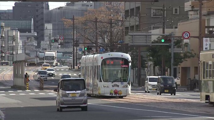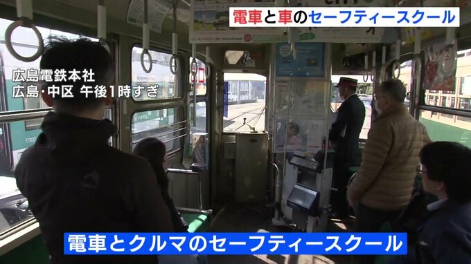 「電車とクルマのセーフティースクール」には10人が参加しました。始めに、車庫内で路面電車と自動車の制動距離の違いや、運転士とドライバーの死角を確認しました。このあと、貸し切りの電車内で、運転席の隣に座って事故が起きやすい場所の説明を受けたり、急ブレーキなどを体験したりしました。広電によりますと、路面電車の接触事故は昨年度、26件あって、このうち電車と併走していた自動車の右後方の確認不足による事故は、16件でした。