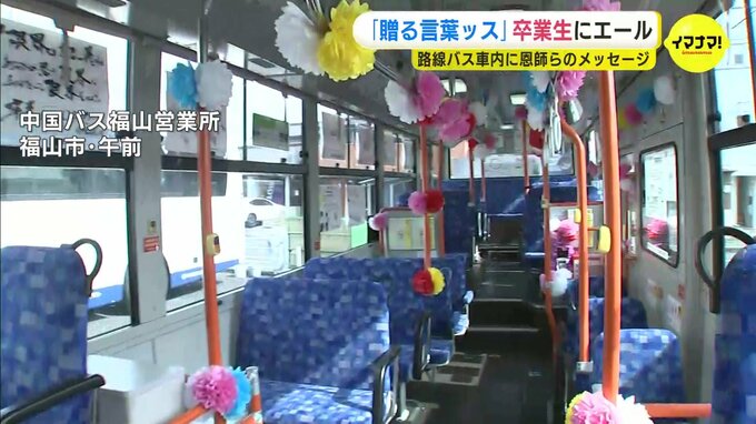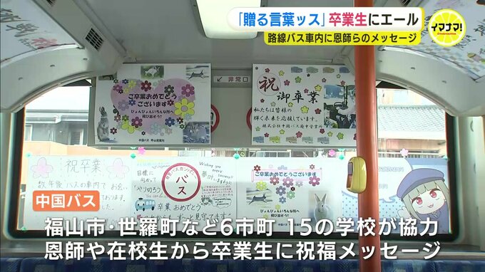 こちらのバスの車内には、「おめでとう」の言葉や活躍を願う言葉がつづられたポスターが…。中国バスは運行エリアのうち福山市や世羅町など6つの市や町の小・中・高校など15の学校に協力してもらい、恩師や在校生から門出の言葉を集めました。