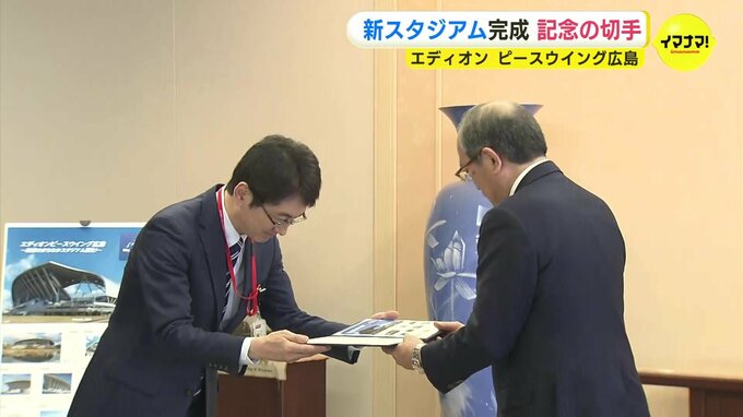 エディオンピースウイング広島のオープンを記念して27日、日本郵便がオリジナルの切手シートを広島市に贈りました。