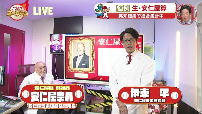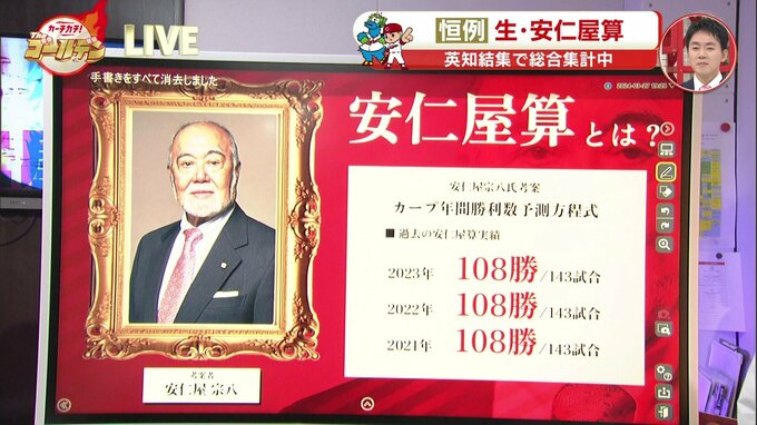 ことしは「安仁屋ラボ」ということで、この研究室からお届けします。あらためてにはなりますが、日本国民1億2000万人、ほとんどの方がご存知だと思います。安仁屋算とは、というところからご紹介します。安仁屋算とは、安仁屋宗八氏考案ののカープ年間勝利数予測方程式のことです。