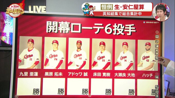 では、まいります。まずは広島東洋カープ、全投手陣のラインナップです。本当に楽しみな顔ぶれがたくさんありますね。