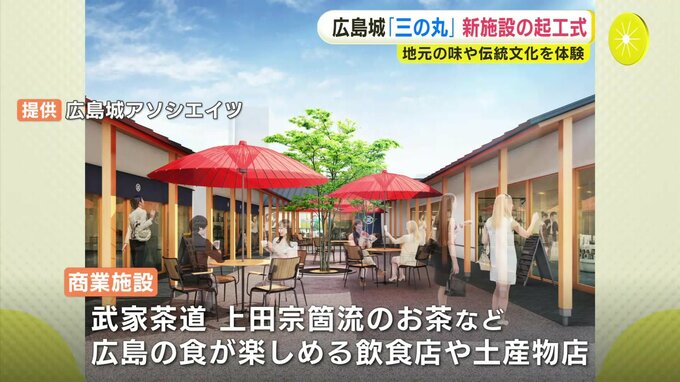 商業施設には広島で古くから伝わる武家茶道・上田宗箇流のお茶といった広島の食が楽しめる飲食店や土産物店のほかに、弓道を体験できる場所など、5つの施設が予定されています。
