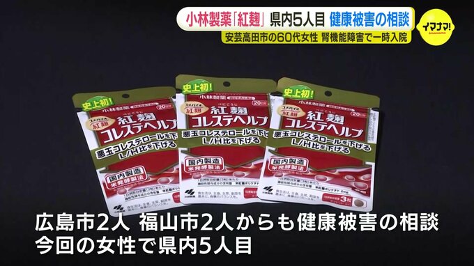 広島県内5人目 小林製薬「紅麹」で健康被害の相談 安芸高田市の60代女性 2024年4月1日(月) 16:15 国内 小林製薬の「紅麹」成分を含むサプリメントの問題で、広島県内で5人目となる健康被害の相談があったことが分かりました。県によりますと、3月29日、安芸高田市に住む60代の女性から県の西部保健所に健康被害の相談…
