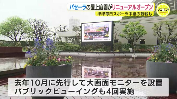 広島市の商業施設「パセーラ」の屋上庭園のリニューアル工事が終わり、3日から一般開放されました。ほぼ毎日、スポーツ中継を見ることができるなど、新たなにぎわいの場所になりそうです。