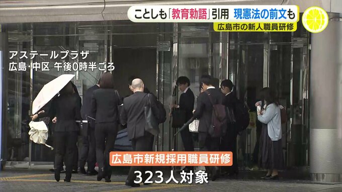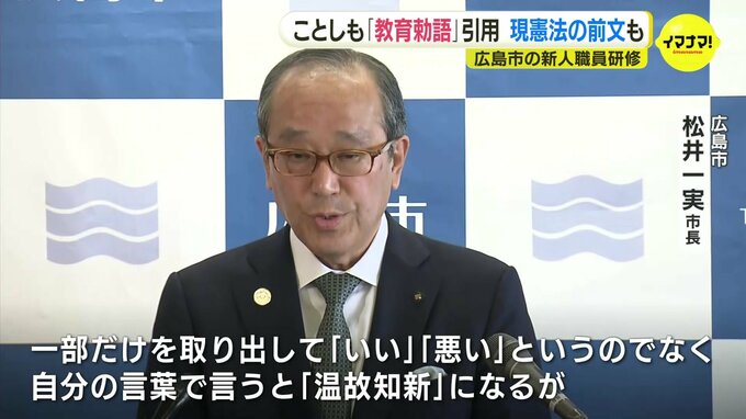 広島市職員の新人研修が行われ、松井一実 市長は自身の講話の時間にことしも「教育勅語」を引用しました。