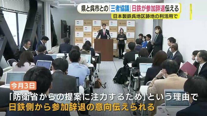 防衛省が先月、「多機能な複合防衛拠点」を新たに整備したいと表明した日鉄呉地区跡地。県はこの跡地の利活用について、「防衛省の案も一つの選択肢」としながら別の案も検討したいとして、今月中にも呉市と日鉄との間で三者協議を開く予定でした。しかし、「防衛省からの提案に注力するため」という理由で今月3日、日鉄側から参加を辞退する意向が伝えられたということです。
