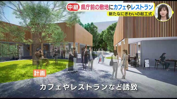 計画では芝生の広場に通り抜けできる道を4つ設け、回遊性を高めます。第1駐車場があった敷地の建物は木造平屋建てで、県庁舎と調和するデザインを採用。この中にカフェやレストランなどが誘致されます。