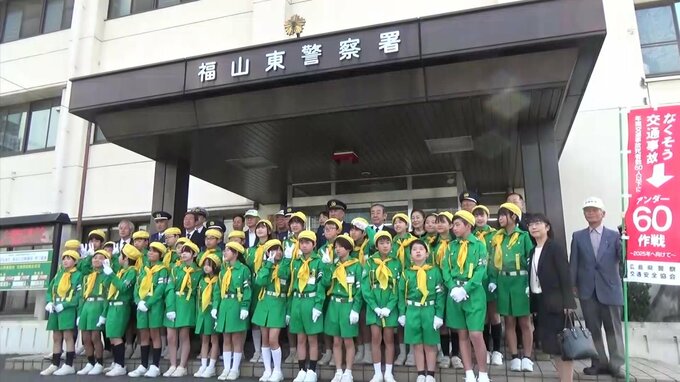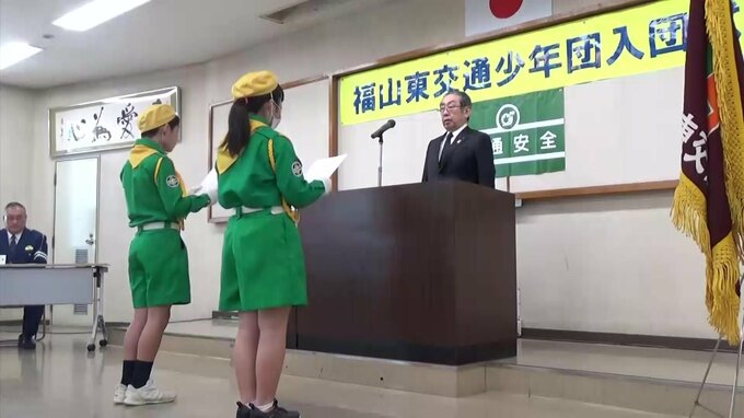 通学路で登校の見守りなどにあたる、交通少年団の入団式が広島県福山市で行われました。