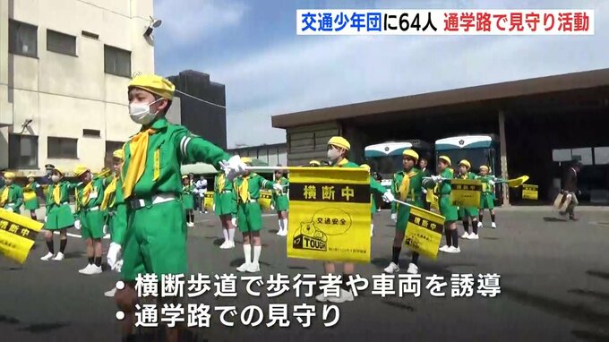 団員の児童たちは、横断歩道で旗を持って歩行者や車両を誘導したり、通学路に立って児童の登校の見守りをしたりします。