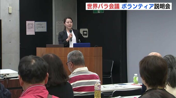 バラ会議は、約40か国から700人の参加を見込む国際会議です。ボランティアの応募には説明会への出席が必要で、広島県福山市内外に住む10代から80代の約60人が出席しました。