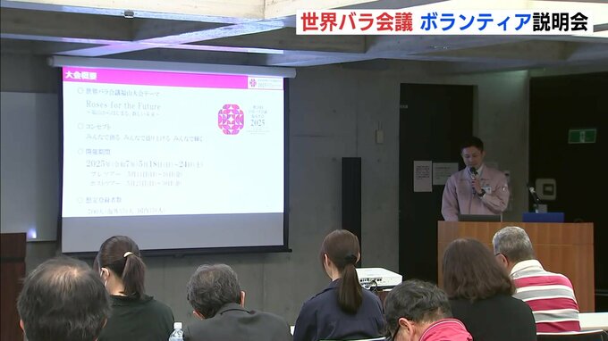 2025年5月の世界バラ会議福山大会で、会場運営などを担うボランティアの募集説明会が19日、始まりました。