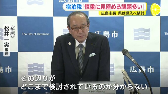 これについて広島市の松井市長は、▽市として宿泊付きの「滞在型観光」の拡大を目指している中で宿泊客の負担となる税の導入が今、必要なのか、▽「宿泊税」以外に財源は確保できないのかなど、慎重に見極める課題が多いという考えを示しました。