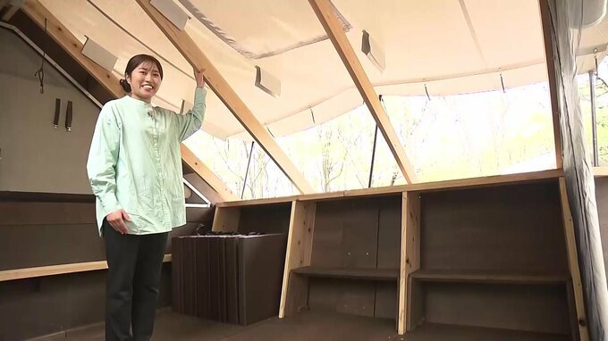 「こちらの施設、木のしっかりとした構造になっていて、屋根はテントのような生地になっています。可動式になっているので自然をゆったりとながめて開放的な空間になっています」