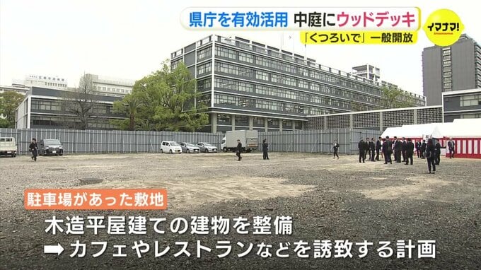 広島市中心部の活性化策として、県庁の敷地を有効活用し、憩いの場にしようと、先月、リニューアル事業の起工式がありました。駐車場があった敷地には、県庁舎と調和するデザインの木造平屋建ての建物を整備し、カフェやレストランなどを誘致する計画です。完成は来年春の予定です。