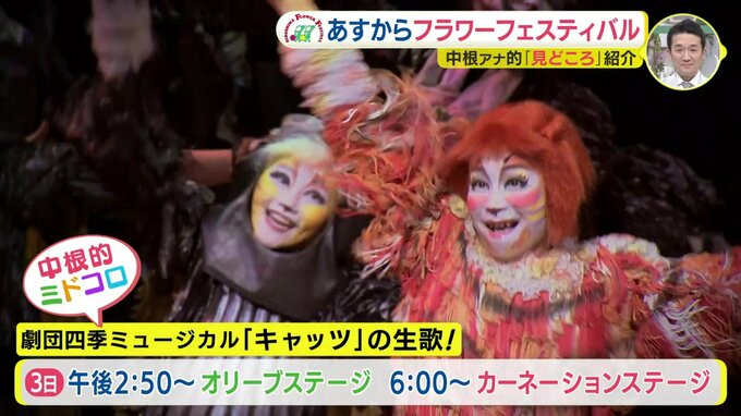 初日3日、“中根的見どころ” です。劇団四季キャッツの生歌が聞ける―。お昼2時50分と夕方6時にステージで劇団四季の俳優さんが、キャッツの劇中歌を披露してくださるんです。
