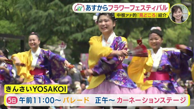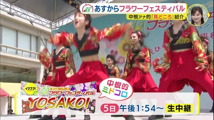 で、5日の “中根的見どころ” は、「イマナマ!スペシャル ひろしまフラワーフェスティバルYOSAKOI」生中継(午後1:54~)です。