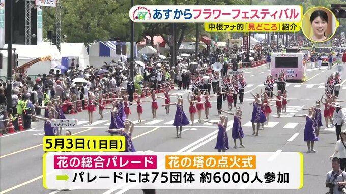 まずは初日。なんといっても花の総合パレード、そして花の塔の点火式のメインイベントがあります。今回のパレードには75団体およそ6000人が参加するんです。華やかでたくさんの方が沿道に駆けつけます。