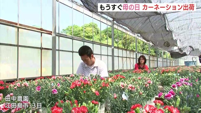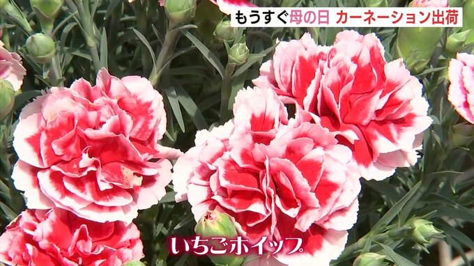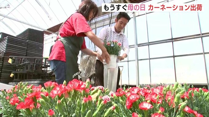 ハウスでは鮮やかな赤やピンクなど、9種類のカーネーションを鉢植えで栽培しています。12日の「母の日」を前に、水をやりをしたりラッピングをしたりして、出荷の準備が進んでいました。