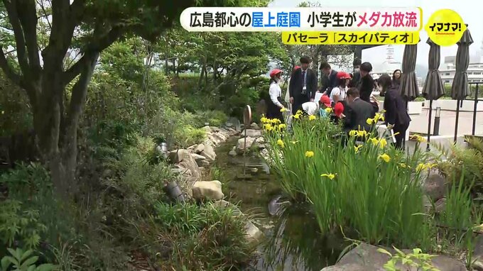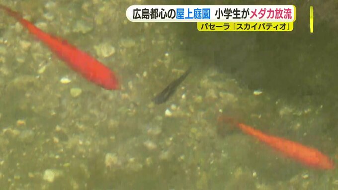 広島市のビルの屋上にある池に、小学生が7日、メダカと金魚を放流しました。