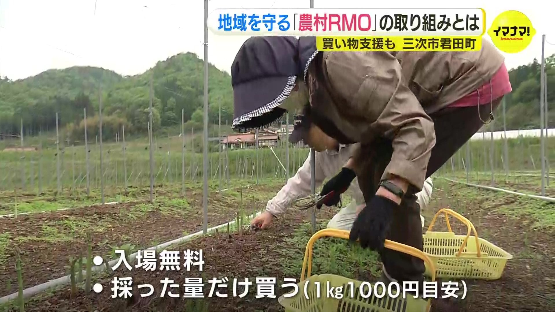 人口およそ180人。三次市君田町の石原地区です。大型連休中のこの日、地元・集落法人の畑を呉市から年配の家族連れが訪れました。露地栽培が自慢という地区の特産品アスパラガスのもぎとり体験です。入場は無料で、取った量だけ買う仕組みです。