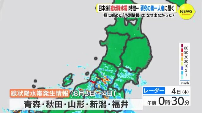 8月3日朝から4日朝にかけて、東北から北陸の日本海に面した5つの県で「線状降水帯の発生情報」が相次いで発表されました。