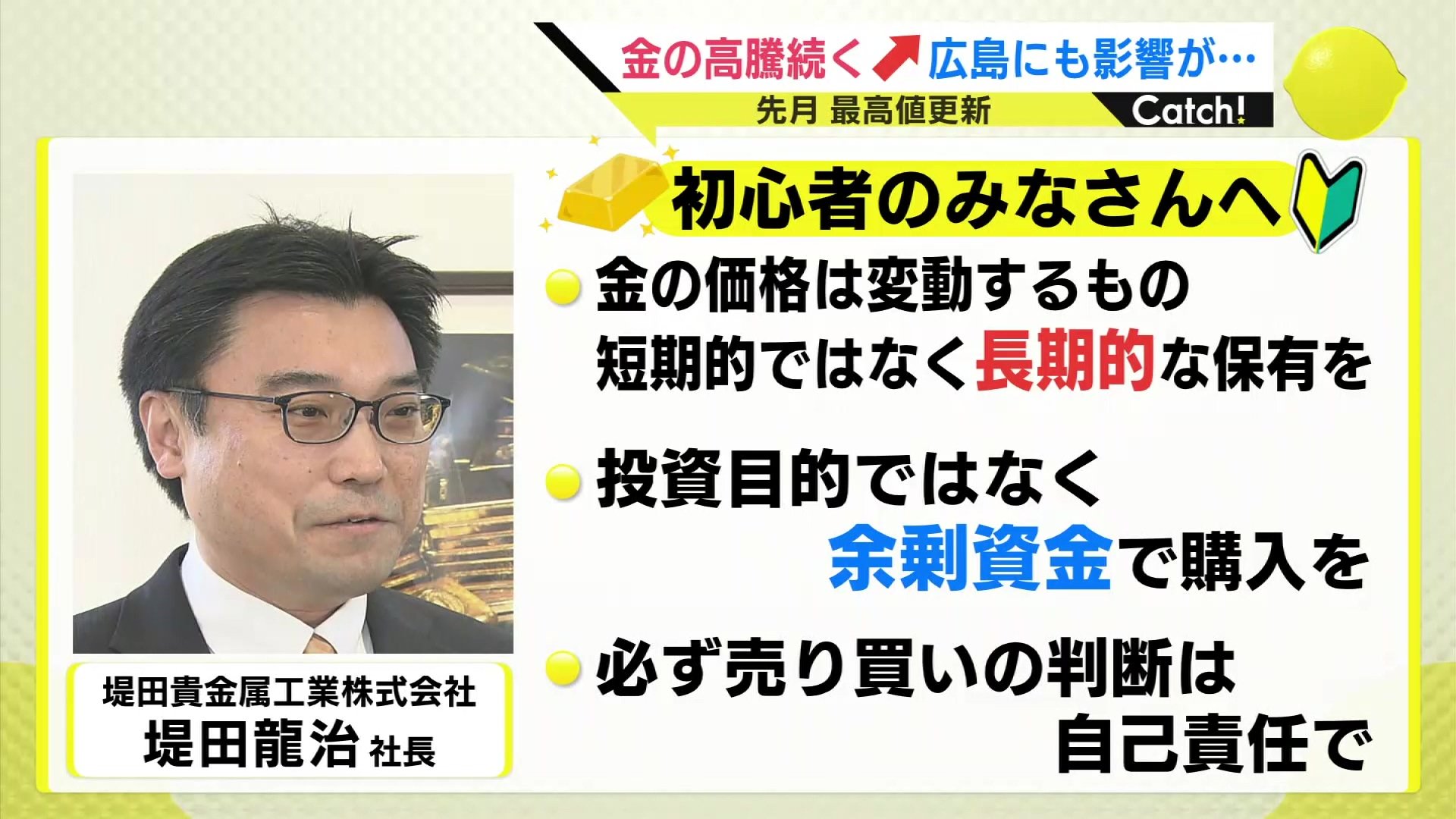 「堤田社長に『金』初心者へのアドバイスを聞いてきました。投資目的ではなく余剰資金で行うこと。金の価格は相場なので上下に動きます。短期的ではなく長期的に保有することを考える。そして、必ず売り買いの判断は自己責任で行う。店頭でアドバイスはいただけるそうですが、『最終判断はお客さん自身で』ということでした。