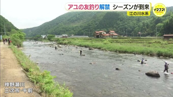 三次市の江の川水系・神野瀬川です。日の出とともに解禁されたアユの友釣りを楽しもうと、10人ほどが川に入っていました。