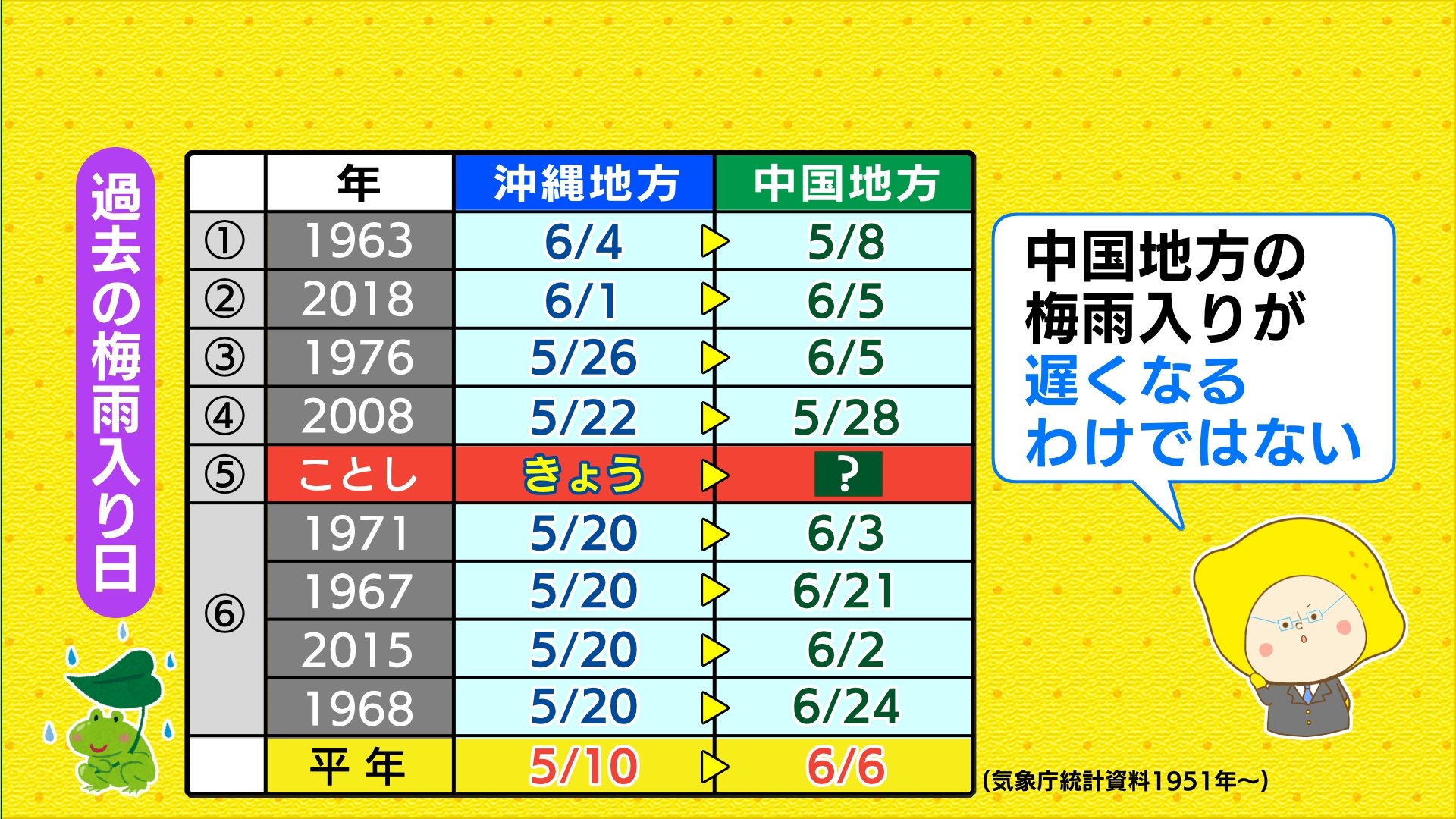 また、きょう気象庁は、沖縄地方と奄美地方が梅雨入りしたとみられると発表しました。沖縄地方では1951年の統計開始以来、5番目に遅い梅雨入りとなりました。沖縄地方と中国地方の過去の梅雨入り日をみると、沖縄地方の梅雨入り時期と、中国地方の梅雨入り時期との関連性は無いことが分かります。つまり、中国地方の梅雨入りが遅くなるわけではないということです。