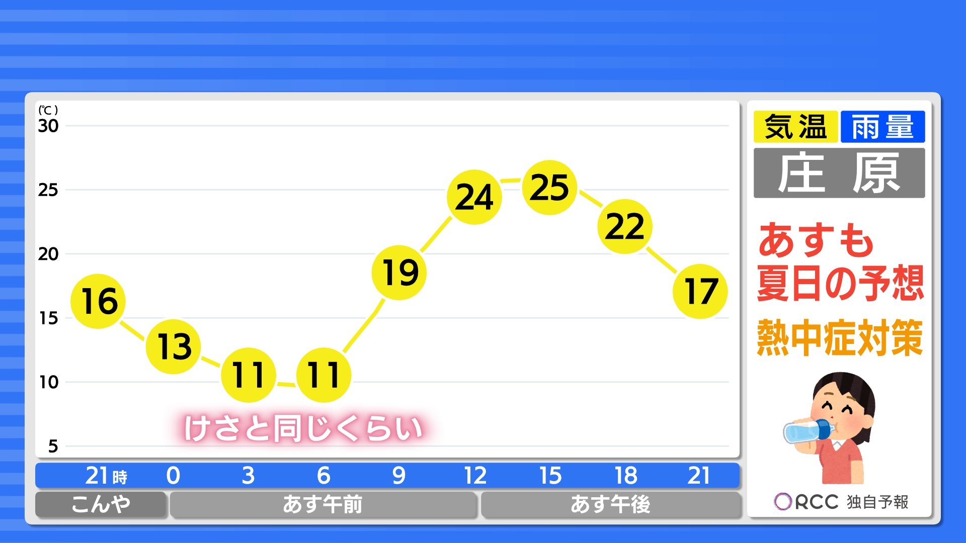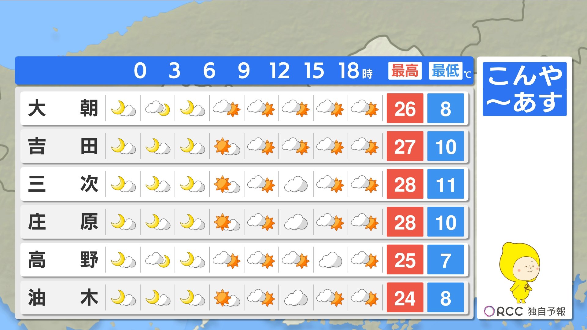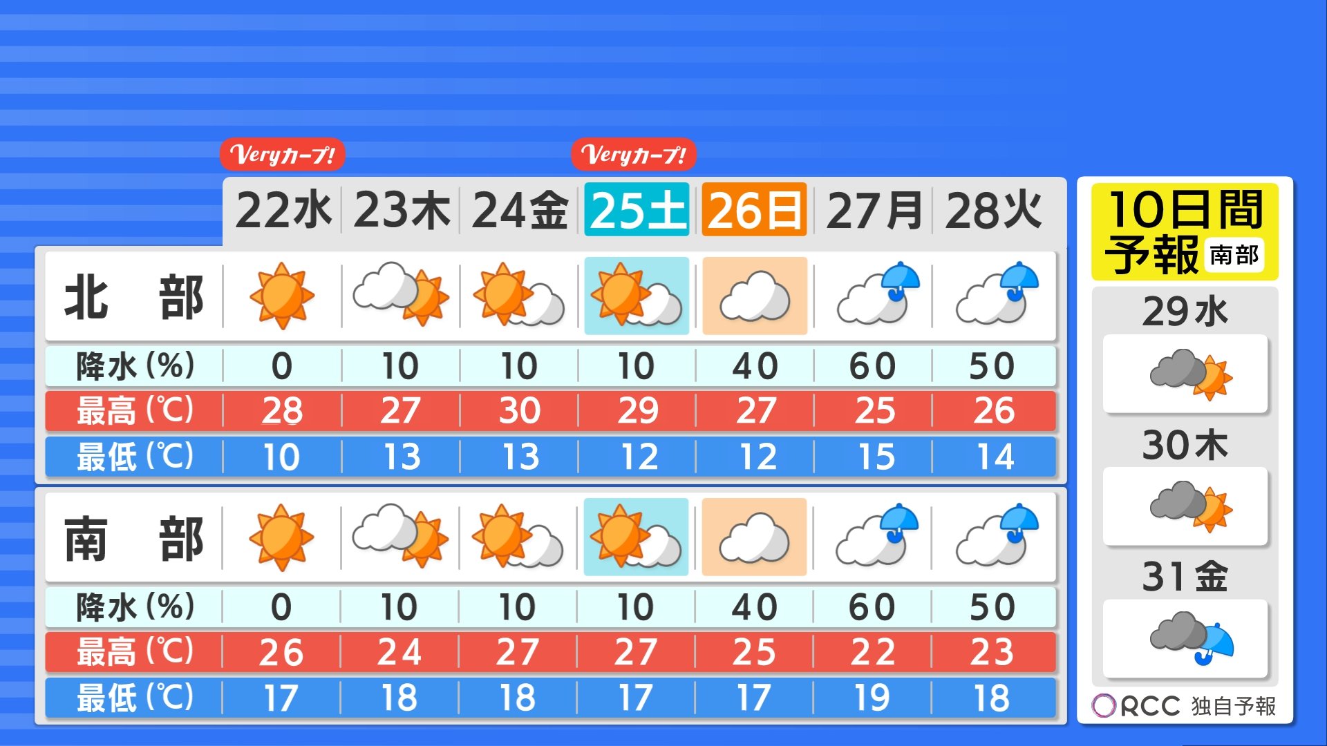 あす朝の気温は、けさと同じくらいでしょう。最高気温は、南部北部ともにきょうと比べると2℃~3℃ほど低いですが、それでも各地夏日の予想です。あすも汗ばむ陽気になり、日中は半袖でも快適な気温でしょう。引き続き熱中症や強い紫外線に十分ご注意ください。