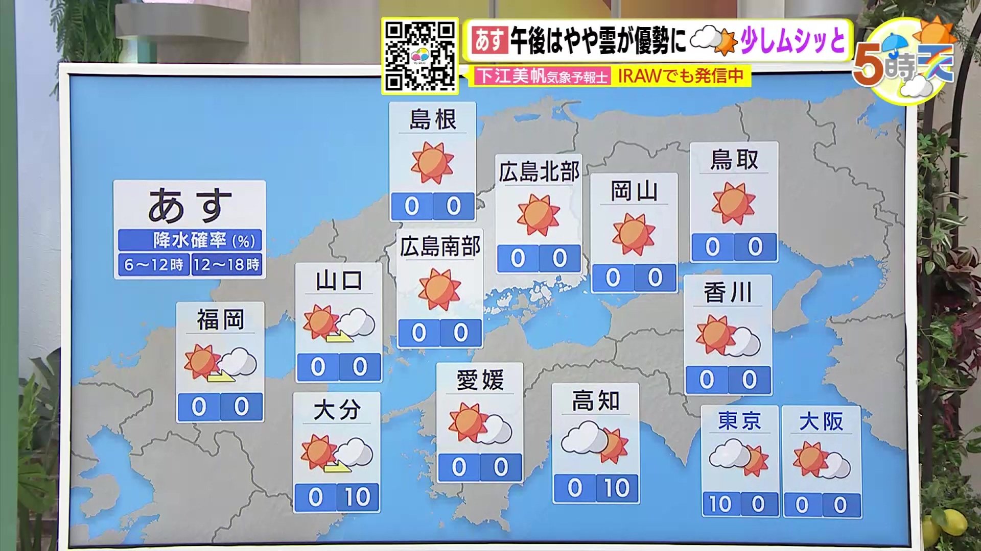 あすも広島県は、高気圧の圏内となりますので晴れる予想です。ただ、前線の北側に広く雲が広がる予想で、この雲の一部が県内上空にもかかる見込みです。高度の高い雲ですので、天気の崩れはなさそうですが、あすは午後を中心に雲が優勢の天気になるでしょう。