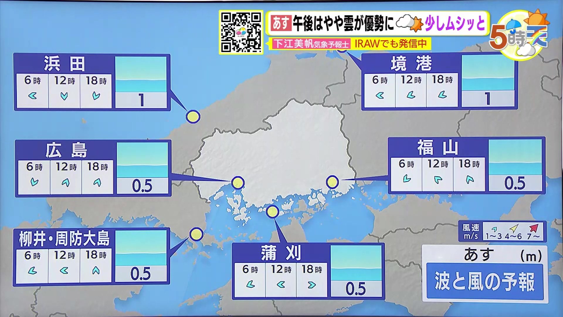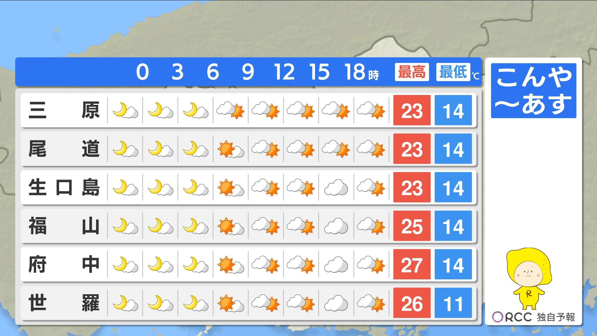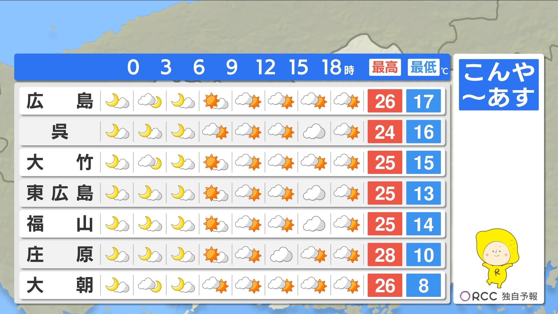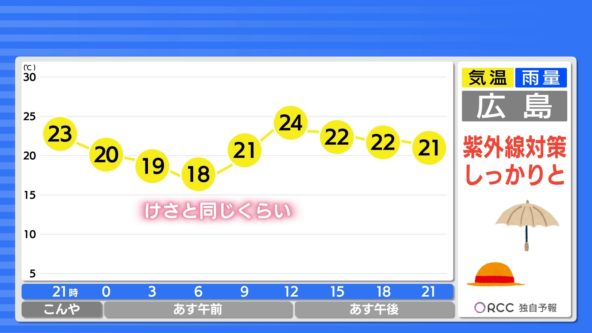きょう21日(火)の広島県は、一日よく晴れ、気温も非常に高くなりました。広島市中区では28.4℃、大竹では29.6℃など、沿岸部を中心にことし最高の最高気温を記録した地点が多くなりました。三入では30.2℃ 加計では31.3℃まで上がり、真夏日となりました。湿度もやや高く、蒸し暑く感じた方も多かったかと思います。