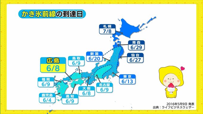 各地で最高気温が29℃前後に達する日を「多くの人がかき氷を食べたくなる日」と定義し、この日を点で示し、同じ時期ごとに線でくくったものを「かき氷前線」と呼んでいます。