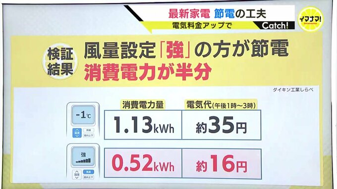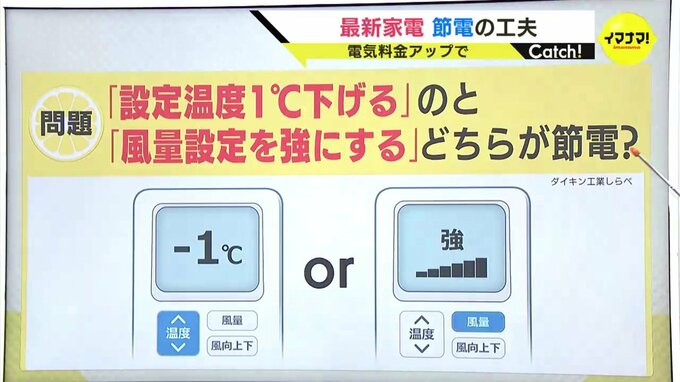 次は設定温度を1℃下げるのと、風量を強にするのでは、どちらが節電か?というもの。