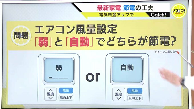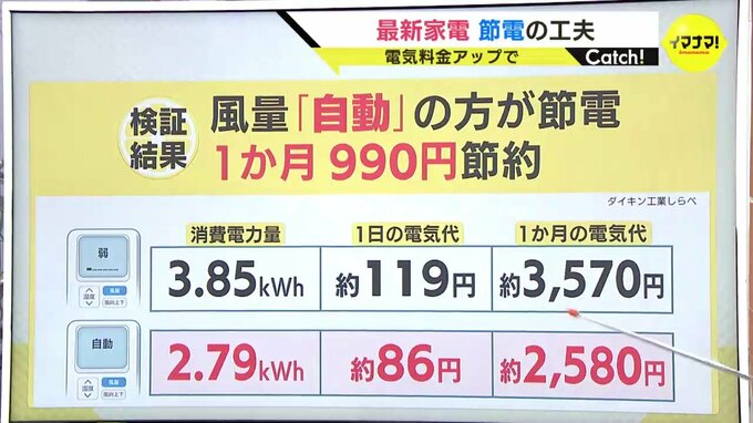 すると、「自動」のほうが、990円少なくなります。弱は送り出される空気の量が減るため、涼しくするのに時間がかかるからだそうです。