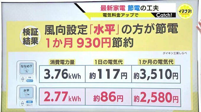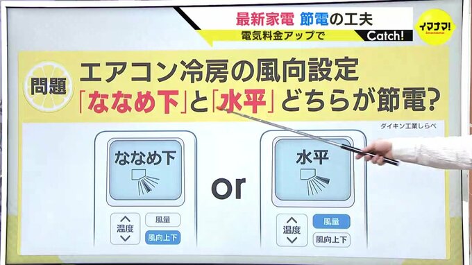 では、エアコンの冷房の風向設定は「ななめ下」と「水平」どちらが節電でしょうか?